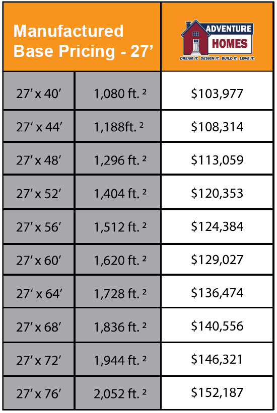 These are our the base prices for our Mojave manufactured single section homes or "single wide mobile homes". Unlike modular homes, which are built to the state code and need to be set on a full basement or crawlspace foundation, manufactured homes are built to the HUD code and go on a pier foundation.