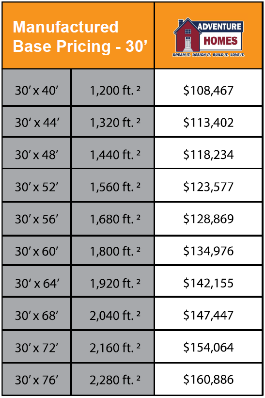 Here you have our base pricing tables where we combine the size and the factory choice to come up with a base price. We use these as starting points in the home pricing process. These are only one of many variables needed to calculate the cost of your home. This is where we factor in such things as sales tax, delivery costs, etc.